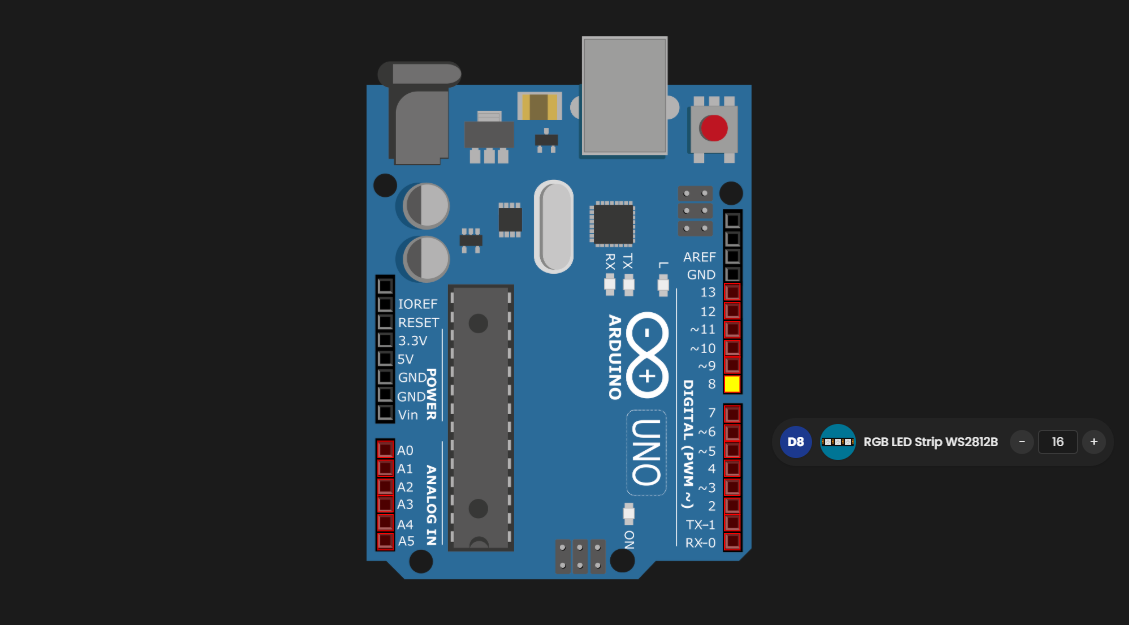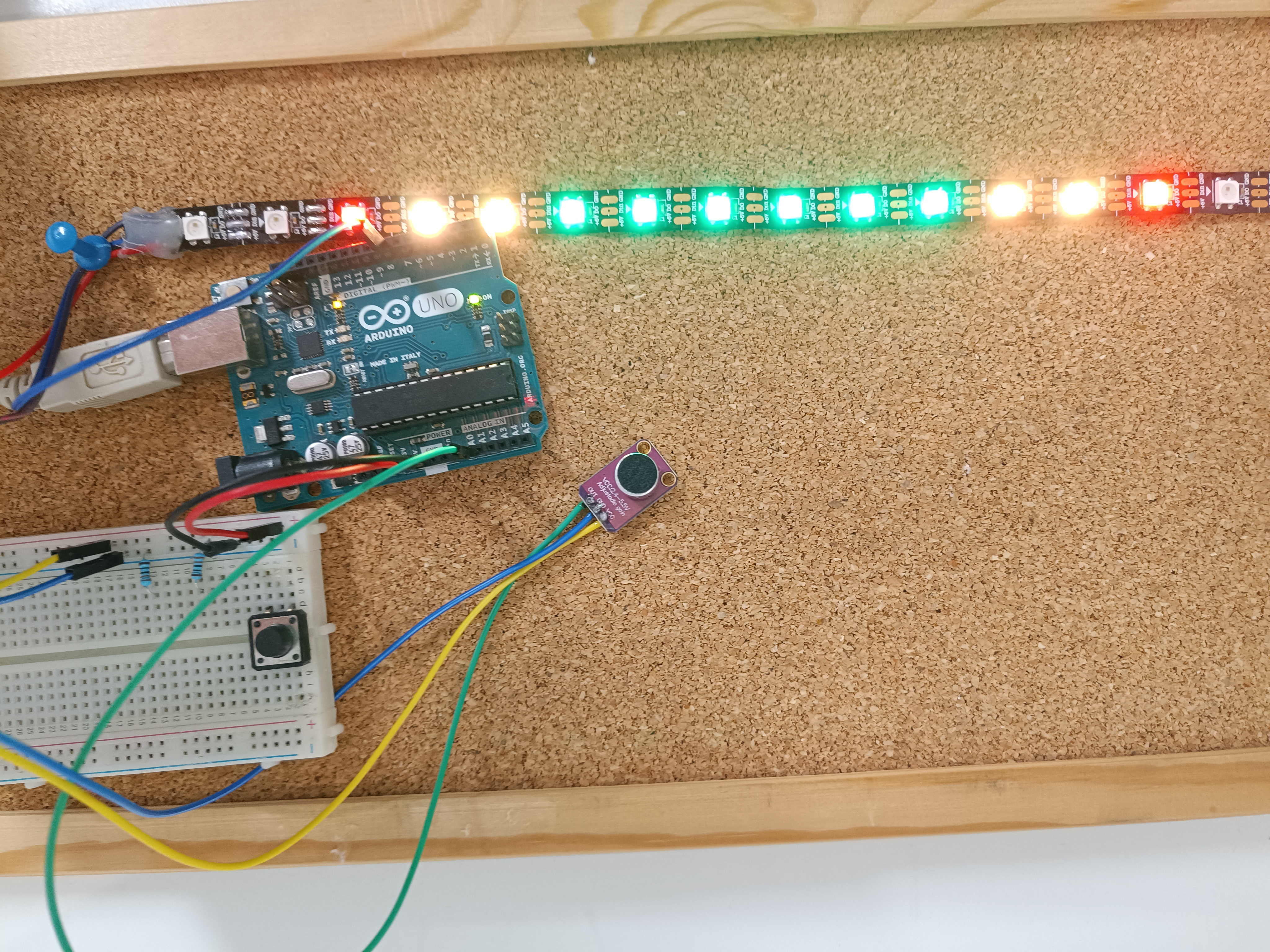 Read the microphone input at 50ms.Map the midpoint sound level (A0 512) to the led strip center LED. All LEDs from the center toward the measured value should turn on. Split the LED strip from the center led outward into three color zones: green, orange, and red.
